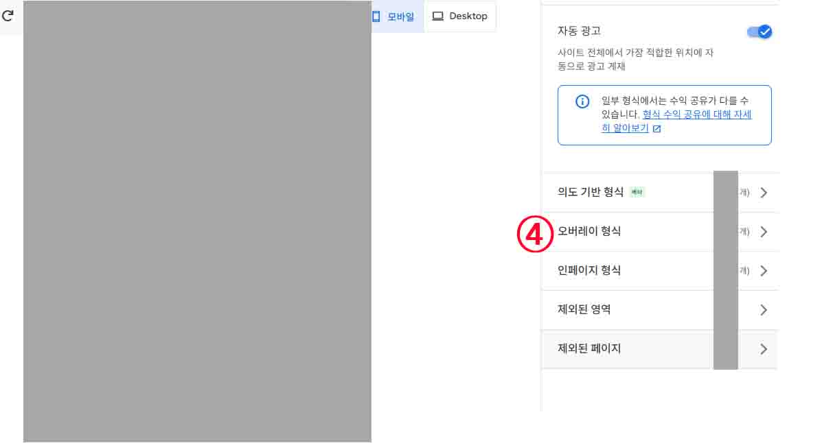 4. '광고 설정'에서 '오버레이 형식' 클릭