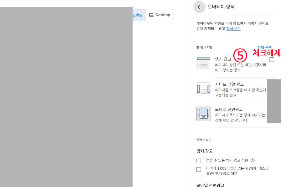 - 애드센스 자동광고 설정에서 앵커/오퍼월 광고 OFF 확인