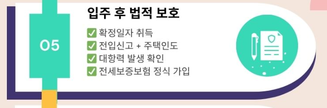 | 계약 후 | ☐ 확정일자 취득 ☐ 잔금 지급 시 등기부등본 변동 사항 확인 ☐ 전입신고 완료 ☐ 대항력 발생 다음날 등기부등본 변동 사항 확인 ☐ 전세보증보험 가입 완료 ☐ 정기 모니터링 체계 구축 |
