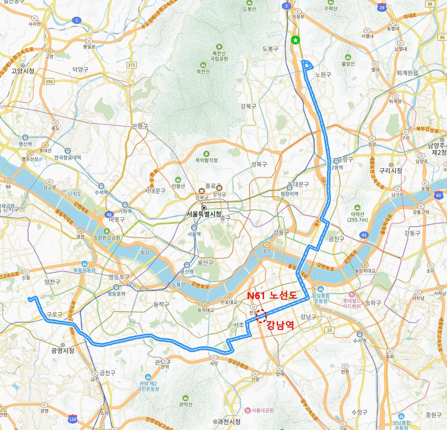 강일동 - 천호동 - 잠실역 - 송파구청 - 삼성역 - 강남역 - 논현역 - 한남동 - 이태원 - 명동입구 - 종로(종각~종로5가) - 대학로 - 성신여대입구역 - 돈암동 - 정릉동 - 국민대학교 - 전체 노선도