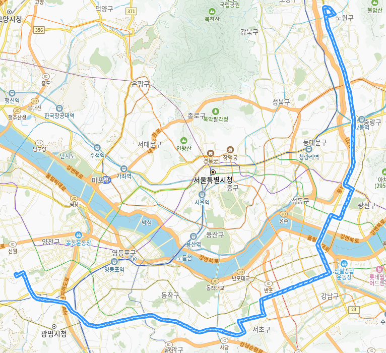온곡중 - 상계초 - 상계주공7단지 – 노원역 - 중계역 - 서울과기대입구 - 공릉역 - 태릉입구 - 석계역 – 한국예대 - 외대앞 - 회기역 - 청량리 – 선설동역 - 동대문 – 약수역 – 신사역 - 논현역 - 강남역 – 선릉역 - 삼성역 - 잠실역 –  석촌역 - 송파역 - 가락시장 - 송파공영차고지