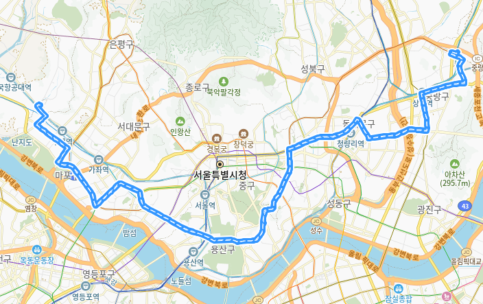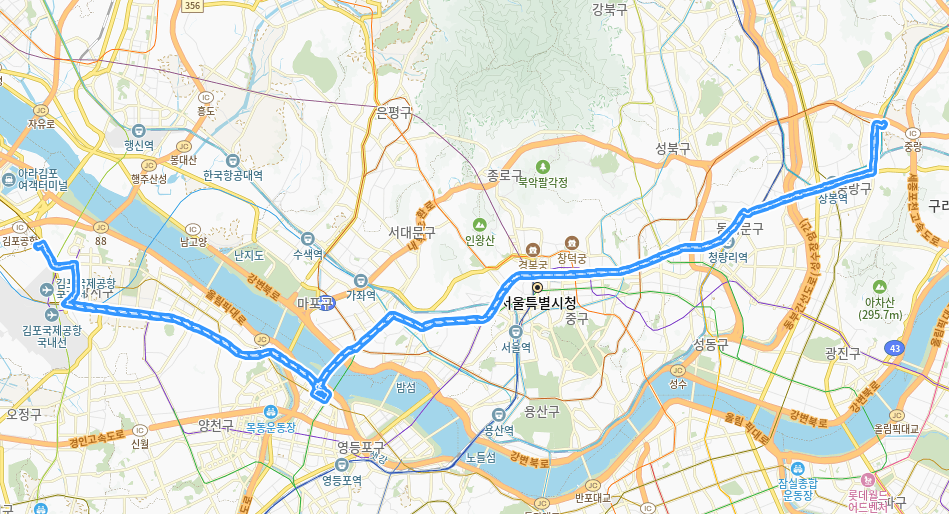 신내역 - 우림시장 - 망우역 - 상봉역 - 중랑역 - 떡전교사거리 - 청량리역 - 제기동역 - 신설동역 - 동묘앞 - 동대문역 - 종로1~6가 - 광화문 - 서대문역사거리 - 충정로역 - 아현역 - 이대역 - 신촌로터리 - 동교동삼거리 - 홍대입구역 - 합정역 - 당산역 - 염창역 - 등촌역 - 강서구청사거리 - 발산역 - 마곡역 - 송정역 - 공항시장역 - 개화산역