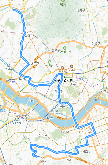 N37 진관차고지 - 구파발 - 홍제역 - 서대문 - 광화문역 - 종로(종각~종로2가) - 을지로2가 - 한남동 - 논현역 - 강남역 - 양재역 - 대치동 - 수서역 - 가락시장 - 송파차고지