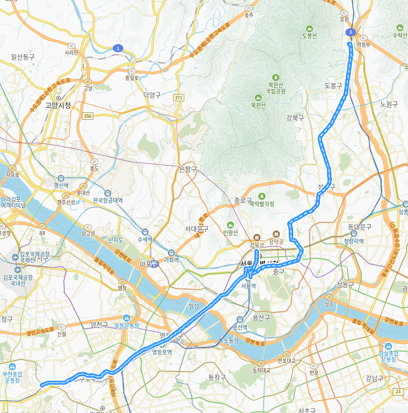 N31 강일동 - 천호동 - 잠실역 - 송파구청 - 삼성역 - 강남역 - 논현역 - 한남동 - 이태원 - 명동입구 - 종로(종각~종로5가) -  대학로 - 성신여대입구역 - 돈암동 - 정릉동 - 국민대학교