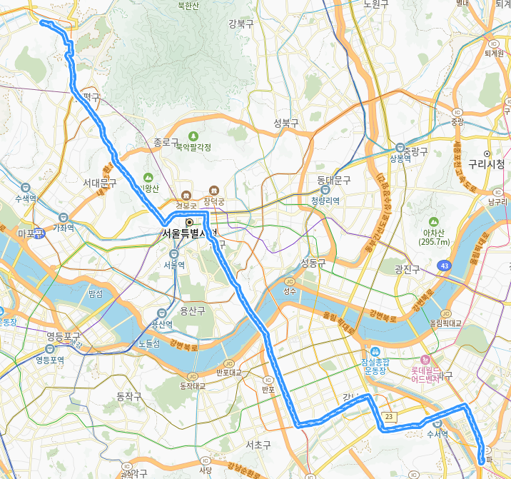 강일동 - 상일동역 - 고덕그라시움 - 고덕역 - 강일중 - 암사역 - 천호역 - 강동구청역 - 몽촌토성역 - 잠실역 - 송파구청 - 삼성역 - 선릉역 - 역삼역 - 강남역 - 논현역 - 한남동 - 한강진역 - 이태원역 - 용산구청 - 명동입구 - 종로(종각~종로5가) -광장시장 - 대학로/혜화역 - 성신여대입구역 - 돈암동 - 정릉동/정릉역 - 국민대학교